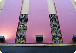 Of particular note is the auditorium ceiling, an undulating swirl of stepped tiers back lit with neon tubing. The auditorium's sidewalls are finished in padded fabric mounted with stylized Diana silhouettes and flanked by murals painted by master decorator Ernest Prentis.